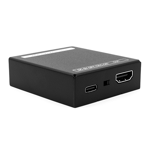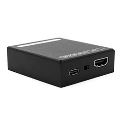 The AEE-200 is a 4K 18G HDMI manager with EDID and HDCP management. It supports up to 4K 60Hz 4:4:4 and HDCP 2.2. This device is powered by HDMI or USB-C, and it supports auto-downscaling. Example use cases would be digital signage, conference rooms, video wall processors, capture cards and streaming encoders, and long cable runs or extenders.