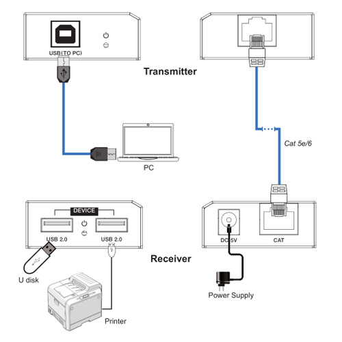 Distance: The EUC-200 Transmitter / Receiver set extends USB 2.0 signals up to 164 feet using a single CAT5e/6 Cable.